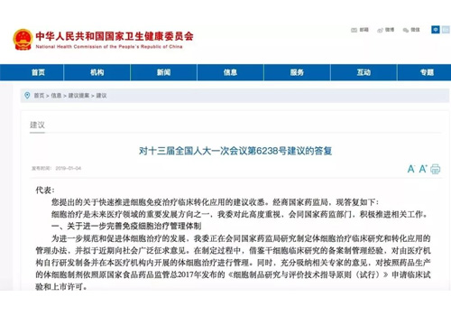 您提出的關(guān)于快速推進(jìn)細胞免疫治療臨床轉化應用的建議收悉。經(jīng)商國家藥監局,現答復如下: