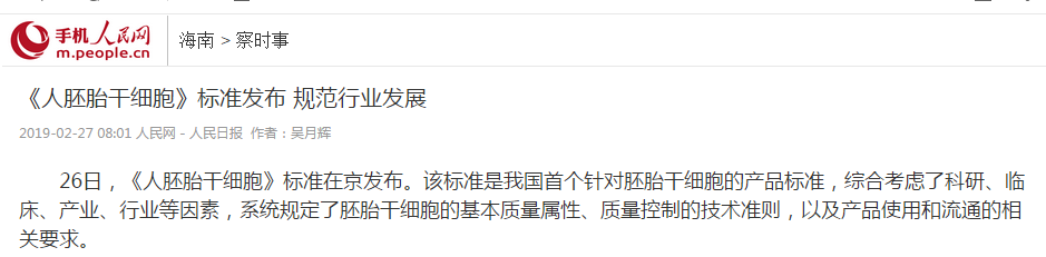 2019年2月26日,《人胚胎干細胞》標準在京發(fā)布。該標準是我國首個(gè)針對胚胎干細胞的產(chǎn)品標準,綜合考慮了科研、臨床、產(chǎn)業(yè)、行業(yè)等因素,系統規定了胚胎干細胞的基本質(zhì)量屬性、質(zhì)量控制的技術(shù)準則,以及產(chǎn)品使用和流通的相關(guān)要求。